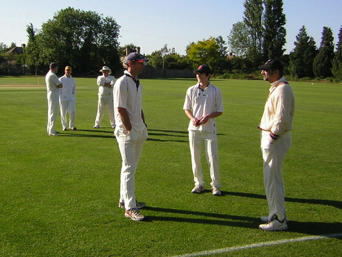 First, amidst the confusion which inevitably surrounds the start of a Remnants internal game, there were umpires, two batsmen, and what looked like a full fielding side out on the pitch before someone realised there was no wicket-keeper. At the point someone turned up and hurtled into the pavilion with the words "I should have been here five minutes ago, to pad up." So Tom Serby, captaining the batting side and padded up to go in at three, marched onto the field to keep for the opposition with the decisive comment, "I like keeping wicket." Play commenced at circa 6.15pm.