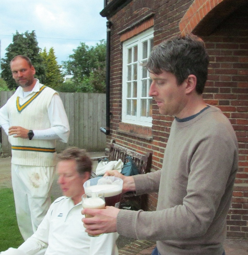 With St Barnabas now in rather deep trouble at 15/4 and the visibility heading from poor to crap, we turned to our slower bowlers. Eli Ellwood (1/23) was unlucky to get just the one wicket (it was off his bowling that the previously mentioned non-catch wasn't taken); Richard Rex (0/20) tried to out-Quentin Quentin (but sadly didn't actually get to bowl at him); Olly Rex (1/11) was a bit too fast for both the batsmen and the now tiring Mihir; and Dave Williams (2/20) gave the ball a real rip, getting more turn than anyone since Mihir himself a few weeks ago. The end result was that we came to the final over with our victory secure but St Barnabas defiantly trying to avoid being bowled out. That effort was almost undone when they went nine down after a lightning return from Richard facillitated a tight run out, but their last pair successfully made it to the end of the innings, and all the way to the bar.