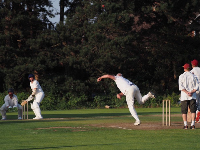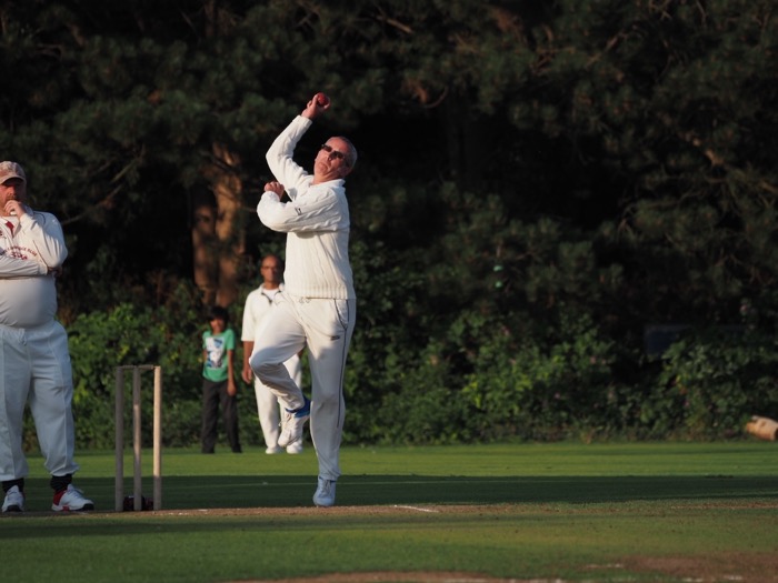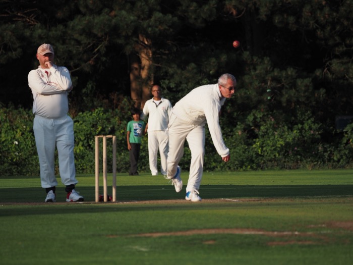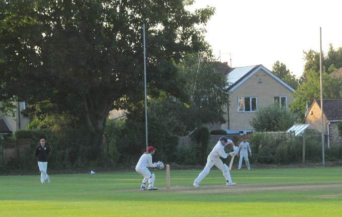 . . . a sense which was only strengthened when the first over of our innings yielded more wickets (one) than runs off the bat (none). But that all changed when Cam Petrie was fed a few leg-side deliveries that he effortlessly swatted to the boundary with such speed that the square-leg umpire, who'd been peering into the setting sun, moved across to point for his own safety. And even though Seb Hammersley wasn't timing the ball quite so well - he seemed to spend much of his innings running between the wickess while berating himself for mis-hitting shots that he felt should have been going to the boundary - we were soon trotting along nicely at 10 an over. In the good old days that would have meant a chance for everyone else to kick back and watch these two knock off the rest of the runs but, as has generally been the case this year, we were playing retirements (negotiated up from 25 to 30 at the toss), so some other contributions would definitely be needed sooner or later.