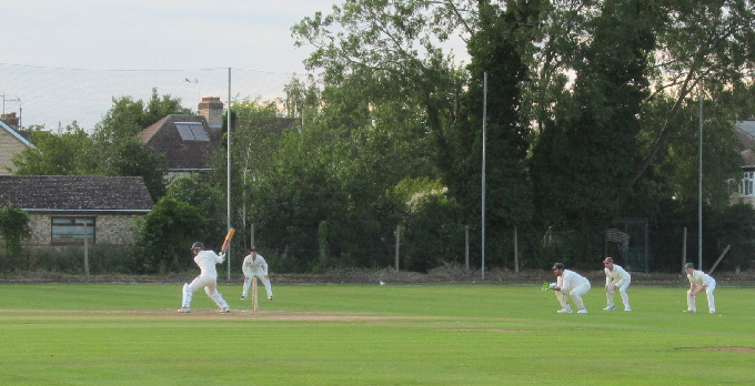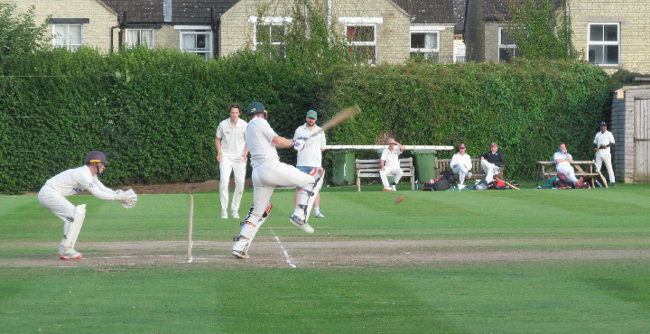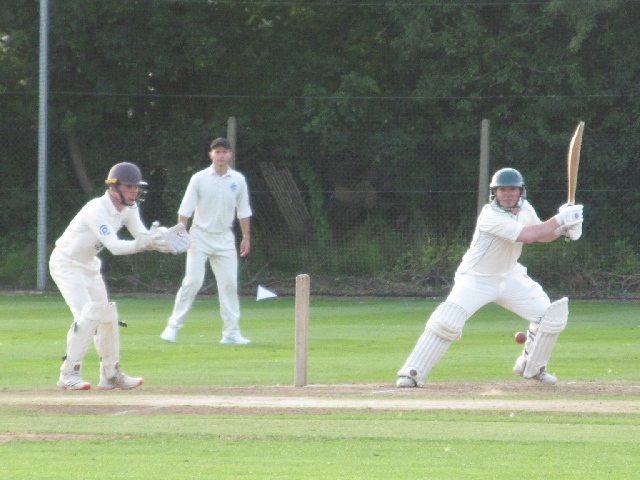 This surprising decision was perhaps justified by the presence in their side of a decidedly sharp opening bowler - no way he'd have been able to bowl late in the second innings. But his speed was a double-edged sword, as when openers Ben Hammersley and Chris Badger got a bit of width the ball flew to the boundary every time - revealingly, always behind square. He was quick enough to get Ben (14 off 11 balls) when he was late on a pull, but Chris was rock solid, almost carrying his bat before retiring on 50* (off 51 balls) in the penultimate over. At the other end he'd gotten enterprising support from James Robinson (10 off 14 balls) and Seb Hammersley (19* off 19 balls), and we looked set to post a stiff target until Lidgate's opening bowlers came back on to great effect, just 12 runs coming from the last two (eight-ball) overs.