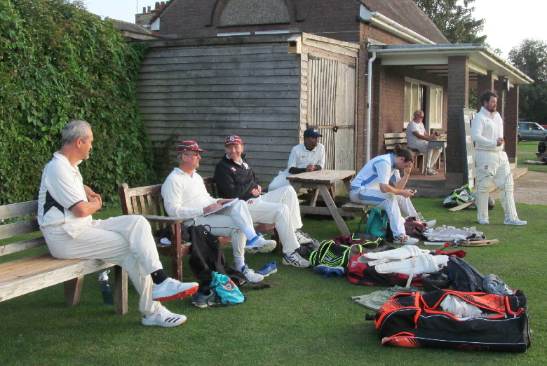 Game day itself was, pleasingly, much calmer: no last-minute drop-outs and all eleven players present by 6pm (even if the start time was given as 15 minutes earleir). Our opposition, Lidgate & Ousden - no, still not a high-end legal firm - were similarly punctual, which meant a proper toss, which they won . . . and so it was a surprise to find ourselves padding up to set a target, having been saved from the fate of chasing in the dark that was such a challenge yesterday.