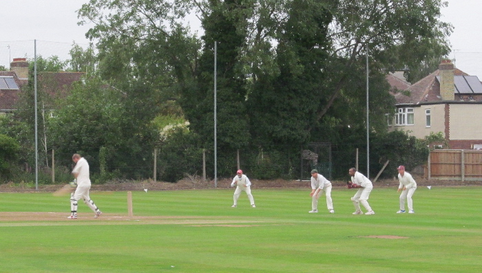 Wonderful as it was to have so many veterans turning out, there was of course the danger of having a rather, er, static side in the field. We partially mitigated against this by naming a twelve - Northstowe generously allowed us to rotate players off in the field, potentially useful for toilet breaks. They also agreed to let us bat first, albeit perhaps a little more grudgingly - and they might not have been so generous if they'd known that half our side was still in the pub when the psuedo-toss took place. We did at least manage to shut down silly talk by one of the opposition that we go for a full length game - he was sure that the clouds were going to break up later in the evening - although even then it turned out that 14x8s was over-ambitious.