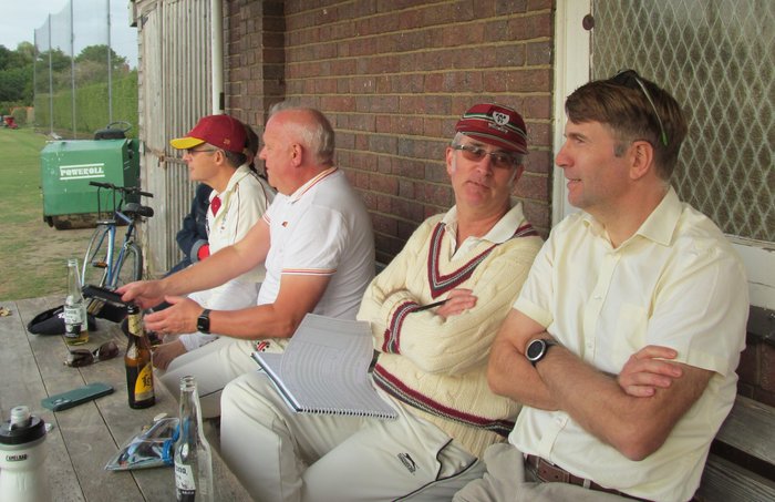 Continuing the "pace off" approach after switching ends to now have the long boundary on the leg-side we ended up with seven-overs each delivered by a different bowler who was slower than the one before. James Alvey (1/21) and John Moore (1/11) struck immediately and Sasha Vail (0/10) induced some uncertain mis-hits, but the real fun was saved for the final over of the innings, delivered by Andy Owen (2/23). He first got the prize wicket of Ed Hyde (who must average something like 100 against Remnants) and then had the new batter caught behind by Marcus Baker first ball. We brought the field in for the hat-trick delivery, which drew the new batted out of his crease and beat him for flight, so it just needed Marcus to complete what appeared to be a straightforward stumping . . . but Marcus thought the ball was going to hit the stumps and then couldn't adjust in time when it didn't. Then, with Marcus (and, presumably Andy) putting his hands up in anguish, the batters saw the chance to scamper a bye - which John was alert to, but there was nobody by the stumps to take his underarm throw. The reprieved batter made the most of his life, hitting the final two balls of the innings to the boundary to leave us with a worryingly high target (given the format) of 120 to win.